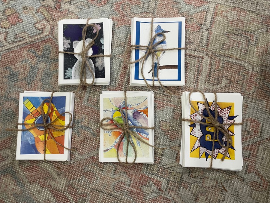 Write your thank you's and notes in style with this batch of student art notecards! You will receive 5 sets of notecards with envelopes featuring the artwork of Five Oaks Academy students.