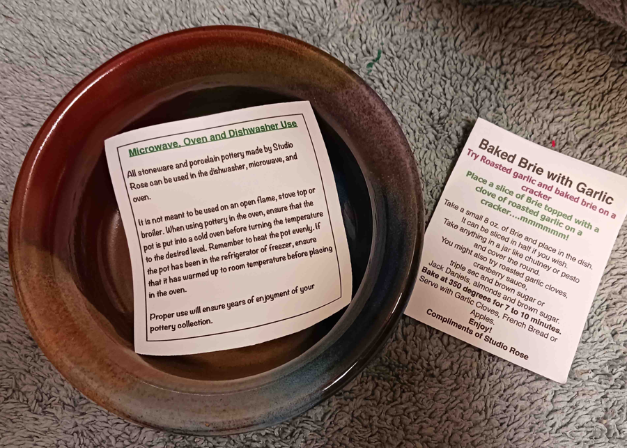 Great Gift Idea! Handcrafted by local artisans at Studio Rose. Just the right size for a small round of Brie Cheese! Handles are on the side for safety. 16 cm D X 6 1/4 cm H