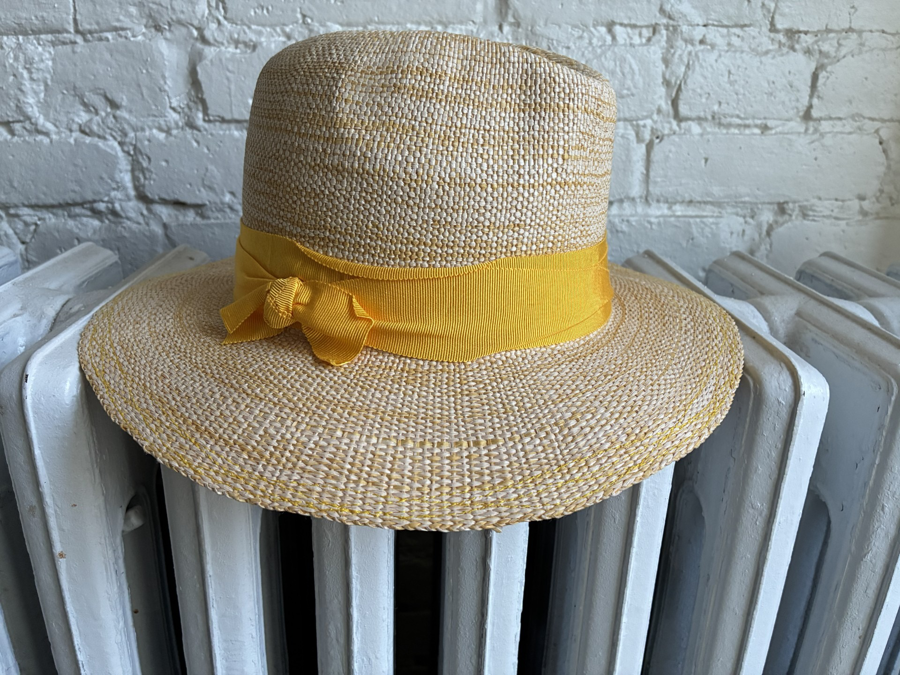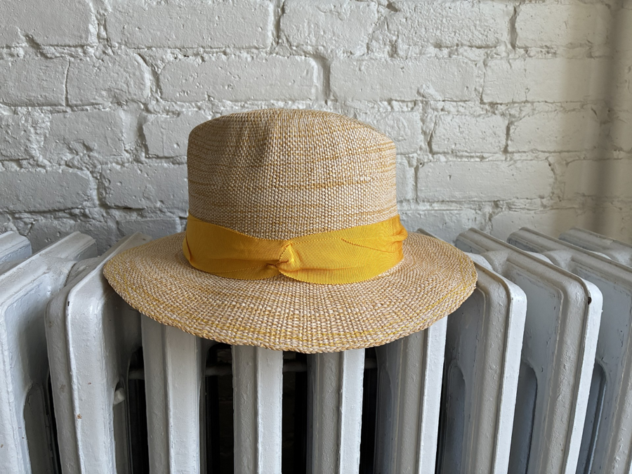 Pliable summer hat with sunny yellow ribbon and bow accent around bottom of crown. Made in the USA. Outside: 100% Paper. Inside: 100% Rayon. Crown height: 5". Brim: 2.75". Fits head size: +/- 22.5". Condition as is. No return / exchange.
