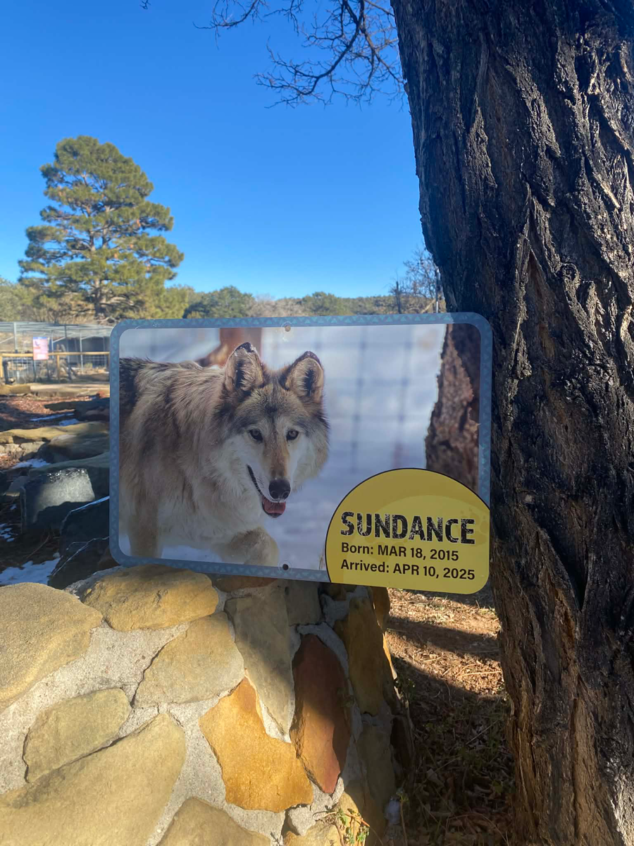 Sundance was a mid-content wolfdog who came to Wild Spirit along with 21 other animals from Indigo Mountain Nature Center, a fellow wolf sanctuary that shut down in 2025 due to the death of their Founder. Sundance (along with her siblings) spent the majority of her life at Indigo Mountain after being rescued as a baby. Though she was shy with our human Caretakers, she loved her companion Milo, a dog who believes he is a wolf. This enclosure sign used to hang on Sundances' habitat during her life here. It is in great condition and measures approximately 19.2" X 13.2". Our hope is to use the funds made from these signs to purchase new "In Memory" versions.