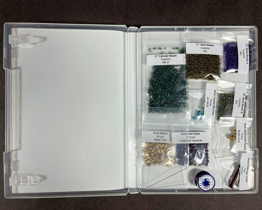 Stitch this 2" wide bracelet using a combination of Peyote, righ angle weave, and netting seamlessly worked from each other. Embelished with sparkly crystals and raised pearls. Kit encludes all materials needed and step-by-step instructions. Created by Liisa Turunen Designs.