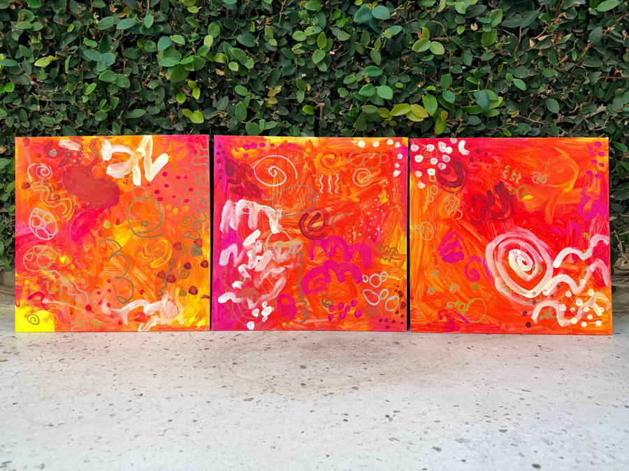 This radiant three-panel artwork, titled "Sunset Serenade," is a spectacular abstract composition created collaboratively by Mrs. King's class. The triptych is a visual explosion of warm tones—dominated by deep reds, vibrant oranges, and hot pinks—reminiscent of a powerful summer sunset or a flickering bonfire. Specifications: • Medium: paint on canvas • Artists: Ms. King's Kindergarten Class • Dimensions of individual painting: 16"x16" This piece will be delivered to the buyer framed. Thank you to Newcomb's Art Teacher, Mrs. Romero, for her collaboration with the Newcomb Academy Foundation to produce this work of art.