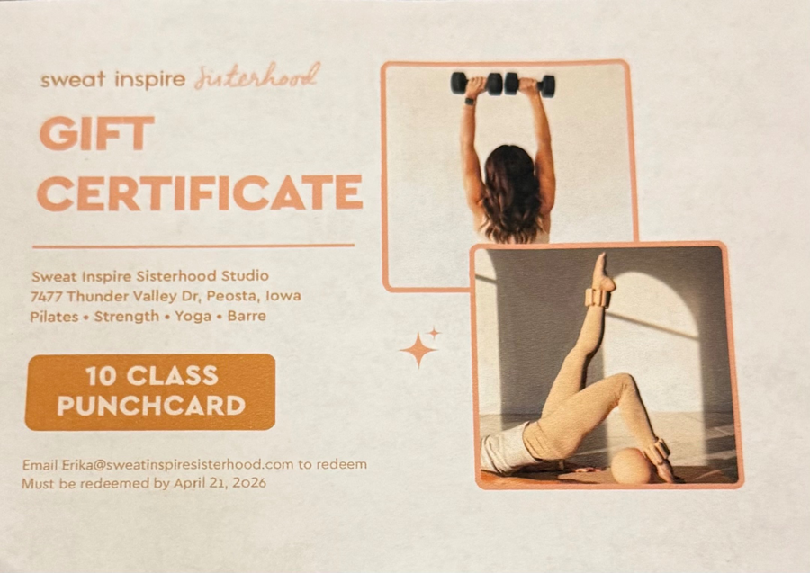 10- class punchcard to Sweat inspire Sisterhood Studio in Peosta.