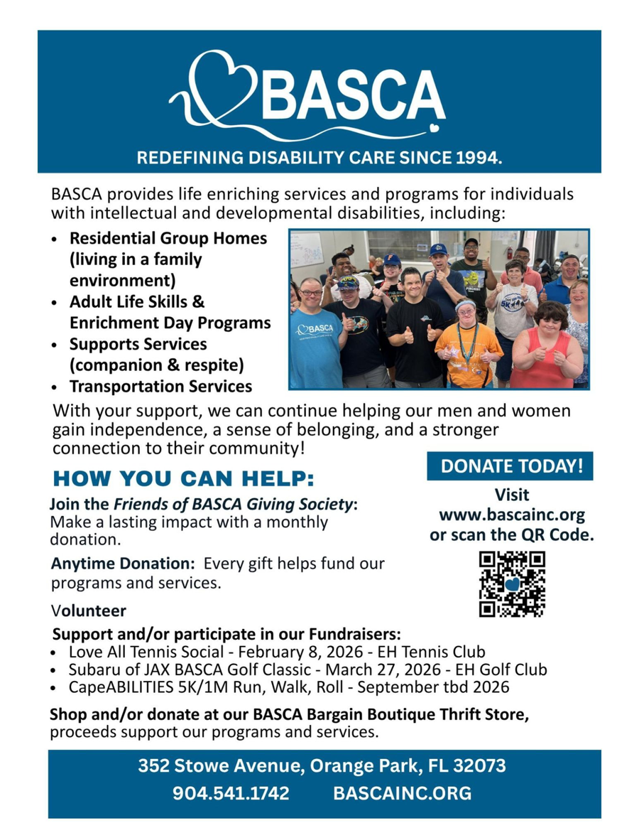 Description: Indulge in something delicious with a $60 gift certificate from Sweet Treats by Sydney, good toward a two-layer 6" round cake—perfect for birthdays, celebrations, or just because! Certificate expires 12/31/2025. About BASCA: BASCA’s mission is to improve the quality of life for individuals with intellectual and developmental differences in Northeast Florida.