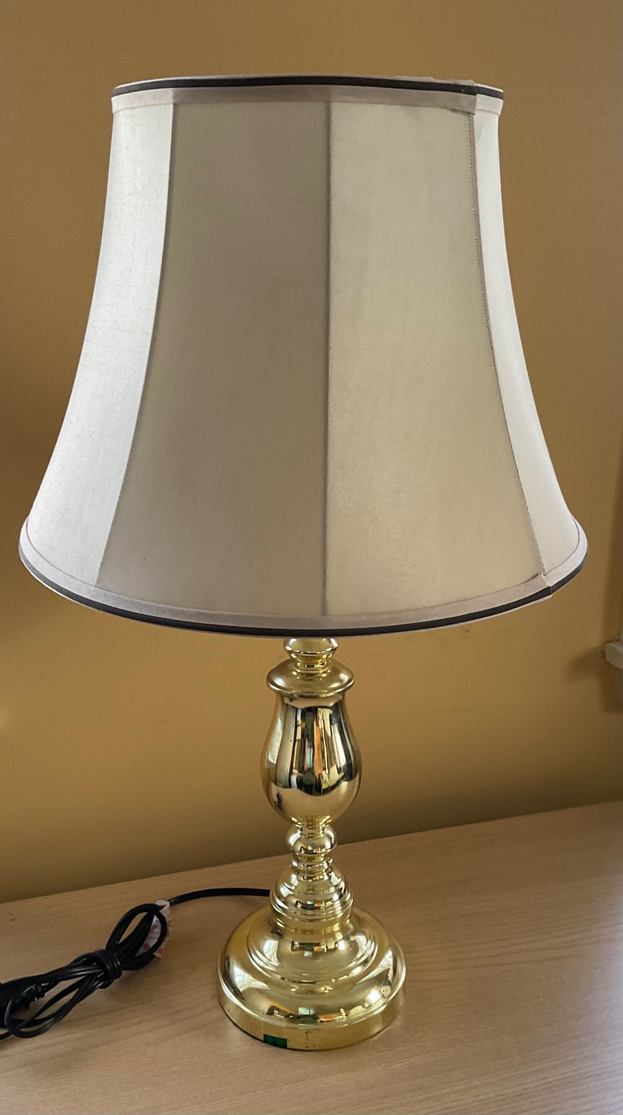 Pair of matching brass finish table lamps with cream-colored silky shades. Bases are 19 inches high, lamps with shades 25 inches high.