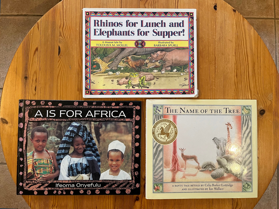Three Africa themed storybooks to delight grandchildren and grandparents alike . This collection includes 'Rhinos for Lunch and Elephants for Supper' (a humorous and ironic folk tale from the Maasai of East Africa in which only the frog is courageous enough to take on a bully), A is for Africa (from A to Z, stunning colour photographs depicting everyday life in Nigeria), The Name of the Tree (A well-known Bantu tale in which animals large and small, weak and strong try to find a way to save themselves from a terrible fate). These are gently used hardcover books.