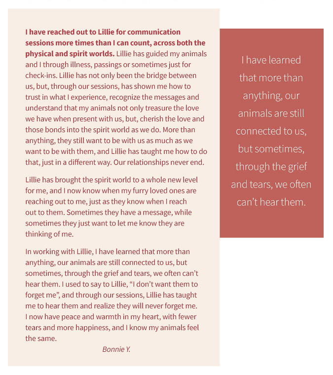 Lillie immersed herself in Advanced Interspecies Communication with pioneers in the field, Dawn Hayman and Penelope Smith as well as years of all her client work.