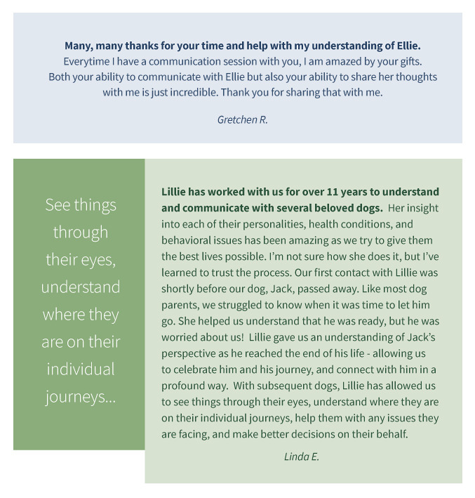 From Debi: “Wow and Thank you! The session we had with you was so incredible. I feel a deeper connection. Knowing my “heart dog” is tuned into my stresses as I work remotely from home, I started implementing your suggestion right away to let her know when “it isn’t hers to carry”. I very much appreciate you and this work you do!”