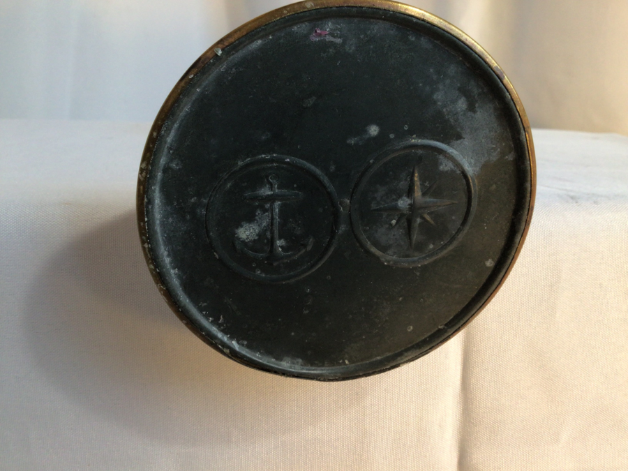 Shown with a votive- but should take a candle with small base. Bottom of brass stand is marked with anchor and compass star. Base and shade stand 14” tall. Brass stand is 4.125” x 10.25” Opening of glass shade is 1 5/8” at bottom