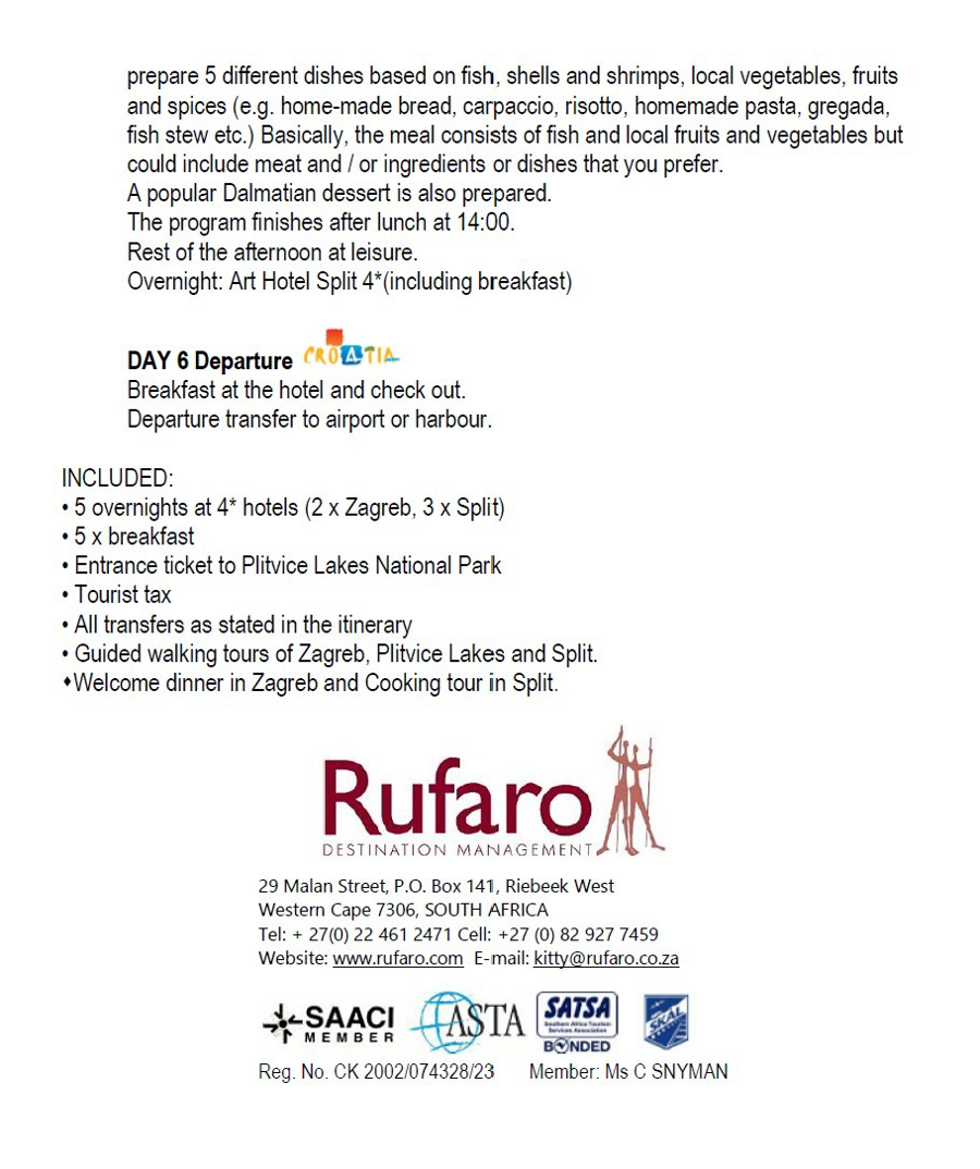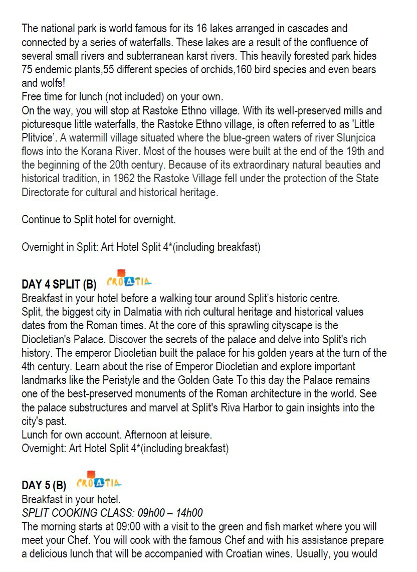 Day 3 a leisurely, scenic drive to Split —stopping at world famous Plitvice Lakes and the Rastoke Ethno village and spending the remaining 3 days accommodations at Art Hotel Split. While in Split, enjoy a walking tour around the historic center, visit emperor Diocletian's Palace; and a market visit and cooking class to prepare a delicious lunch accompanied with