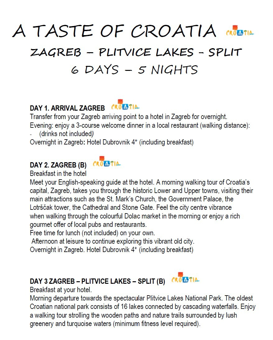 6 days/ 5 nights, 2 people will enjoy 3 days in Croatia’s capital city of Zagreb inclusive of a welcome dinner, walking tour of the historic Lower and Upper towns with English speaking guide, accommodations at Hotel Dubrovnik, 4* with breakfast.