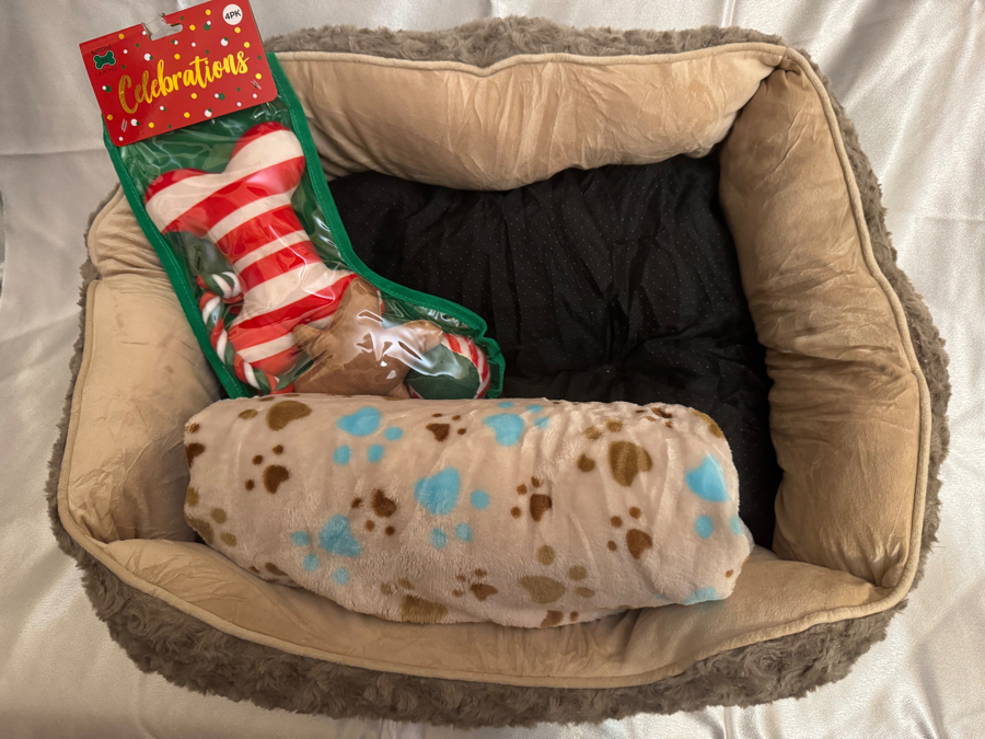 Luxury dog bed with a 6 pack toy stocking , small pet blanket