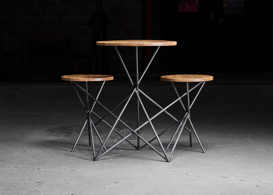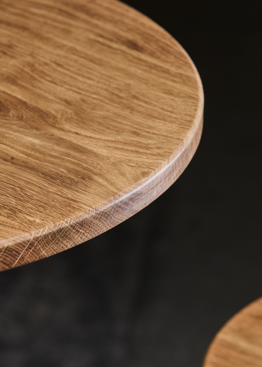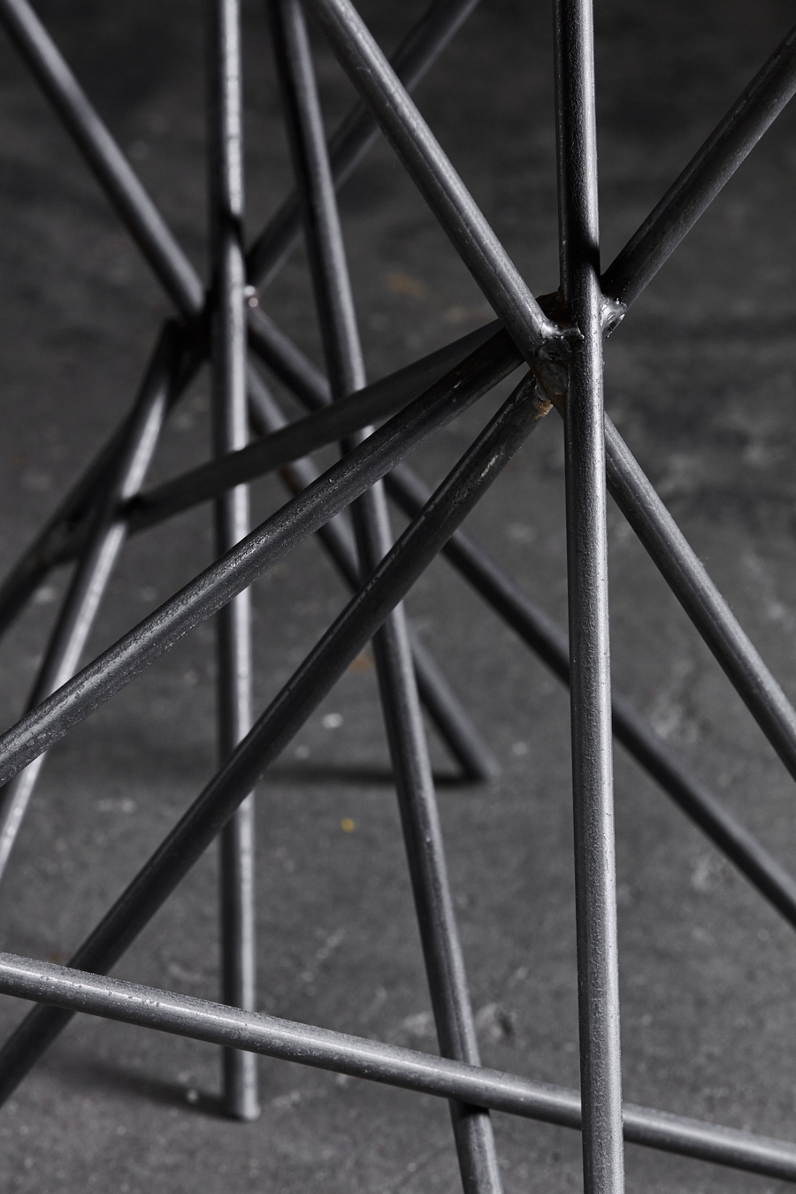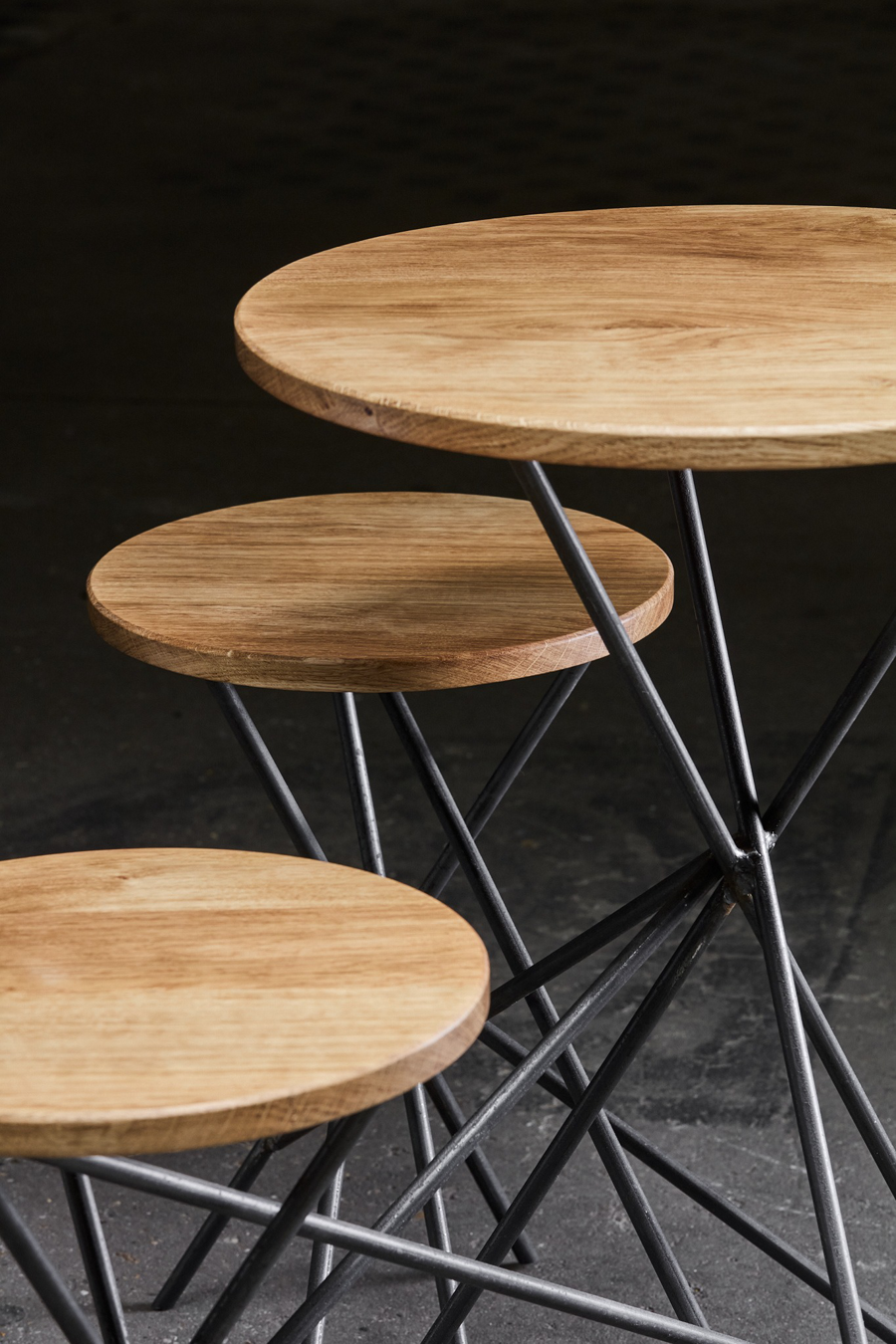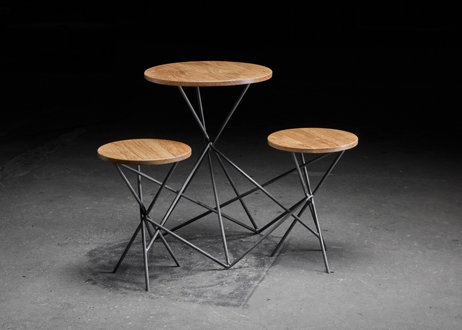 Raw steel rod and solid oak Table 48 x 70,5 cm Chairs 33 x 48 cm