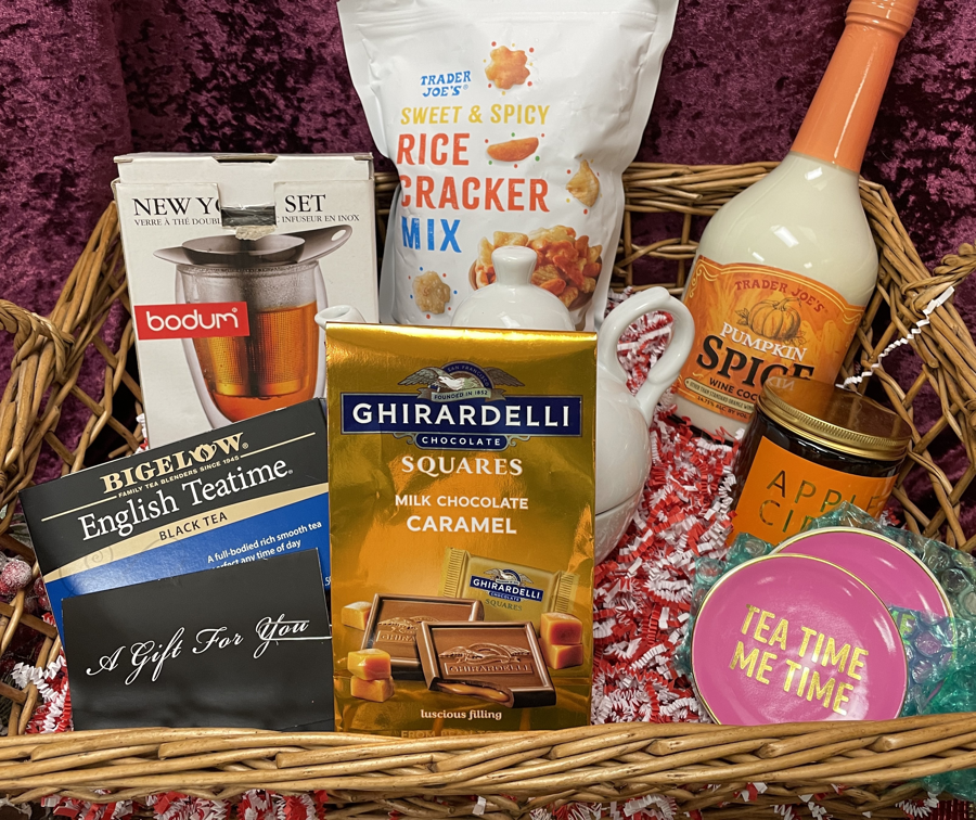 #1044 - Indulge in a cozy tea-time experience with this charming gift set. It includes a white teapot and cup set, a tea infuser, and English teatime tea bags, along with four Teatime Me Time small plates. Enhance the ambiance with an apple cider-scented candle, and enjoy tasty treats like sweet & spicy rice cracker mix and Ghirardelli milk chocolate caramel. The set also features a Trader Joe’s pumpkin spice wine cocktail and a $25 gift card to Miya Moon Restaurant in Lone Tree—perfect for a relaxing and indulgent afternoon or evening. NEW / Not redeemable for cash / **Must be age 21 + to purchase / present ID upon winning.