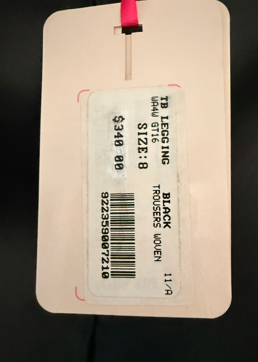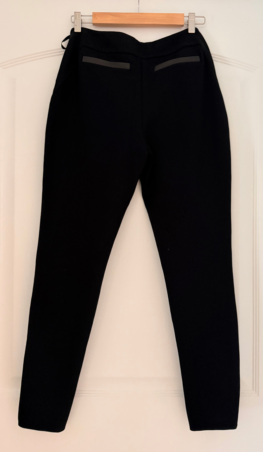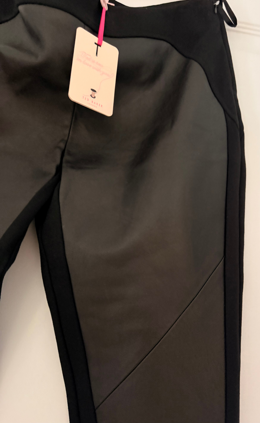 In typical Ted Baker ease of wear, these multi-functional, tapered leggings are a delight for any event from work to play. Featuring a panel of faux leather down the front, a side zipper, and decorative back leather pocket flaps (not fuctional). There is a nice stretch on the fabric to allow for a curvy fit. Color: Black Condition: Brand New Size: US 8m Length: 37 inches
