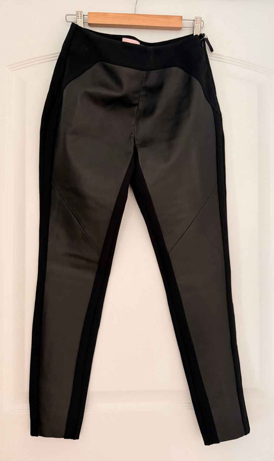 In typical Ted Baker ease of wear, these multi-functional, tapered leggings are a delight for any event from work to play. Featuring a panel of faux leather down the front, a side zipper, and decorative back leather pocket flaps (not fuctional). There is a nice stretch on the fabric to allow for a curvy fit. Color: Black Condition: Brand New Size: US 8m Length: 37 inches