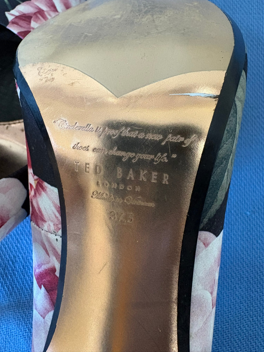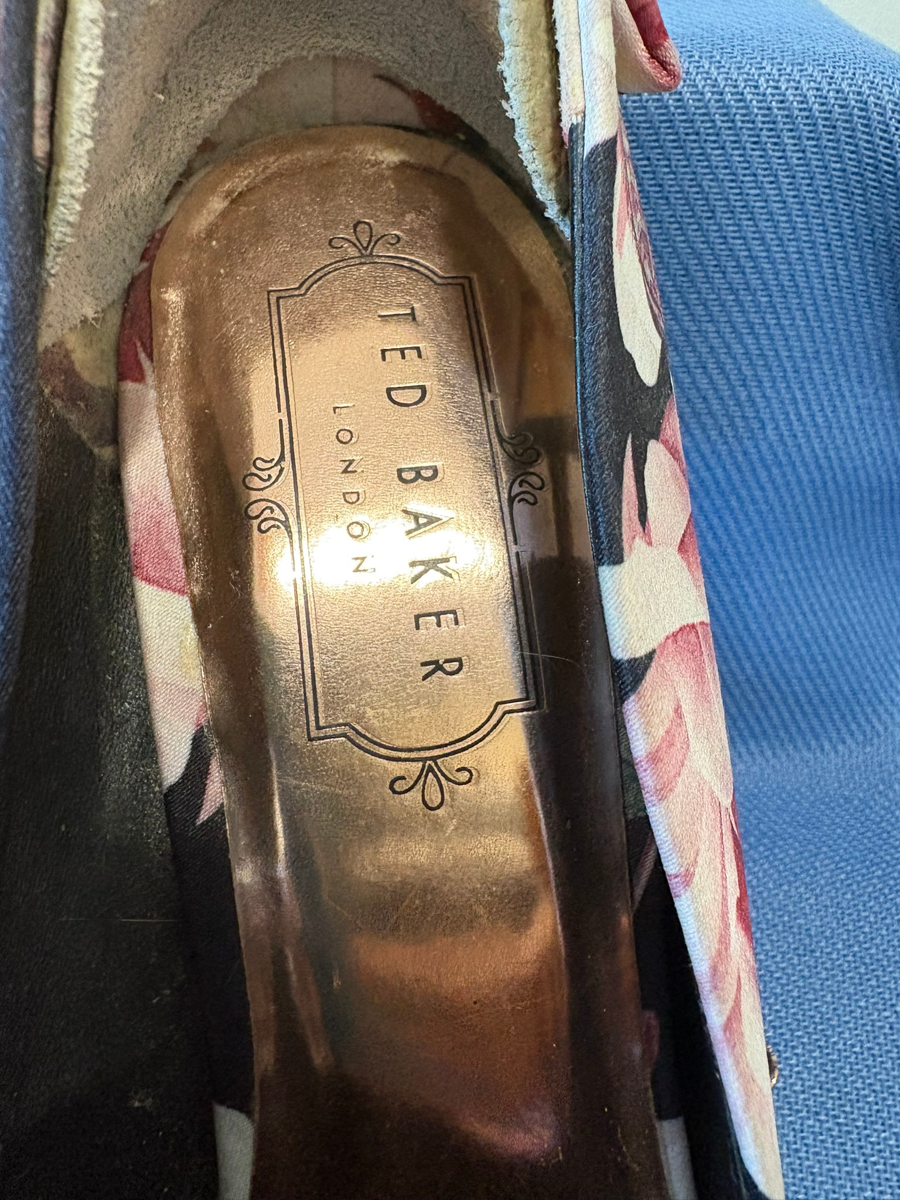 Ted Baker Floral Heel Court shoe has a black satin finish and vibrant pink floral print. The pointed-toe pumps feature a soft sheep leather lining and a classic four inch stiletto heel. The shoe has a satin upper with a metallic-toned interior, and a designer bow on the heel.