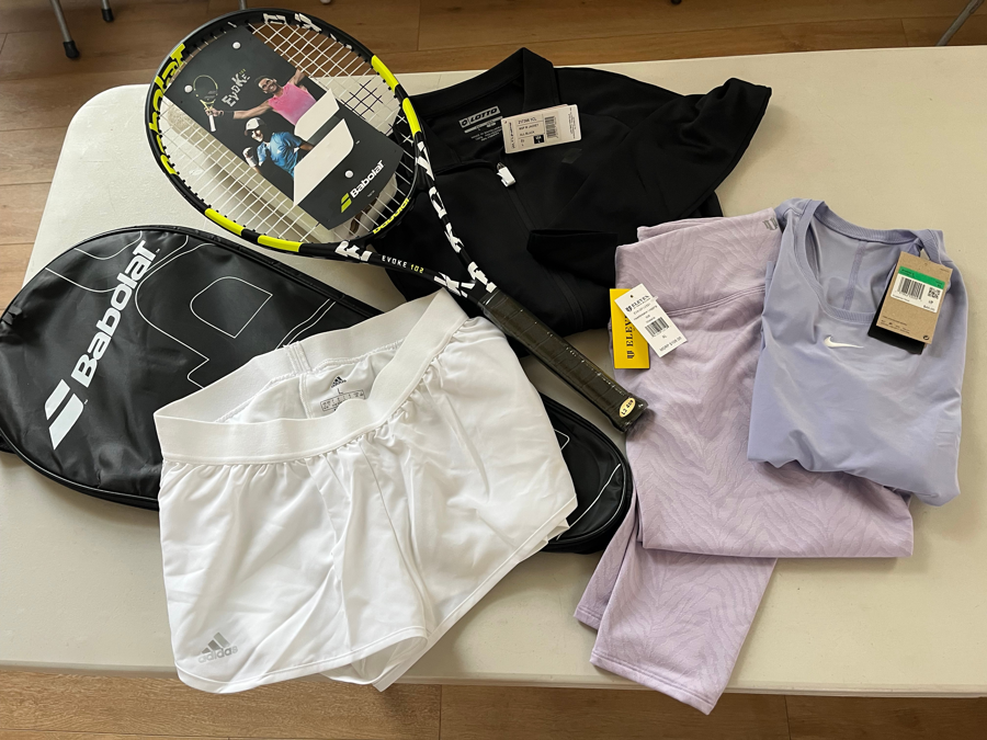 Tennis Collection Includes: Babolat Tennis Racquet and Cover ELEVEN by Venus Williams Leggings Size XL LOTTO Women's Jacket Size L Adidas Shorts Size L Nike Shirt Size XL