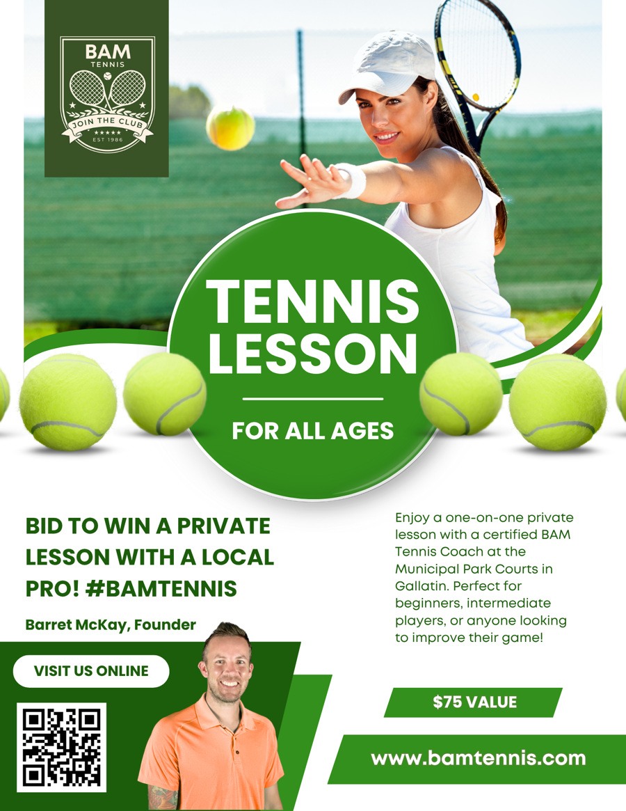 Private tennis lesson with a local Pro!!! Enjoy a one-on-one private lesson with a certified BAM tennis coach at the Municipal Park Courts in Gallatin. Perfect for beginners, intermediate players or anyone looking to improve their game.