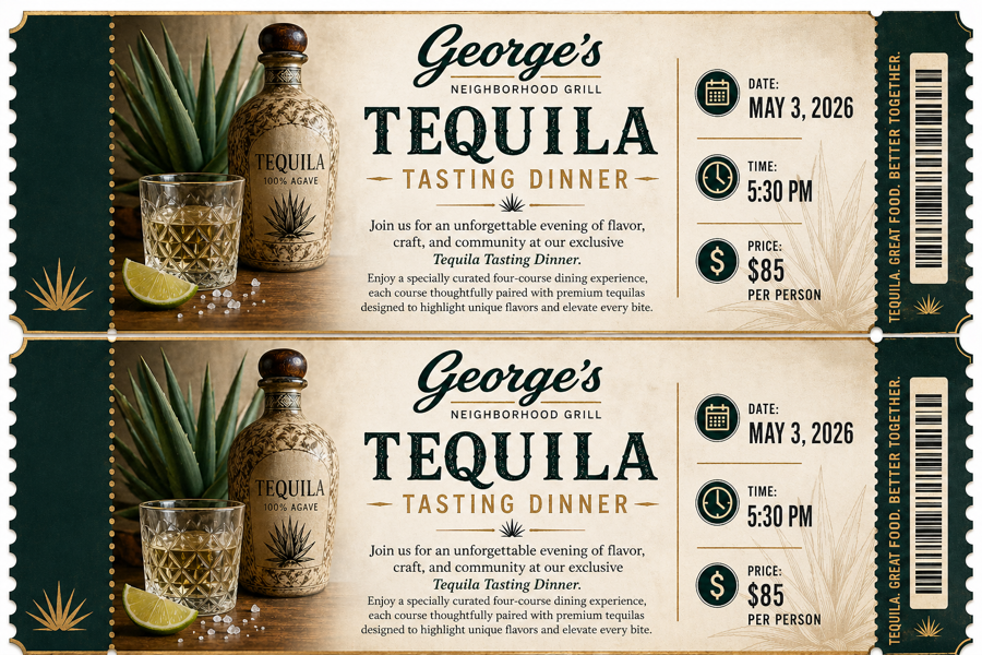 Treat yourself (and a guest!) to an unforgettable evening of flavor, craft, and community at George’s Neighborhood Grill. This exclusive Tequila Tasting Dinner for Two features a specially curated four-course dining experience, with each course thoughtfully paired with premium tequilas designed to enhance every bite.