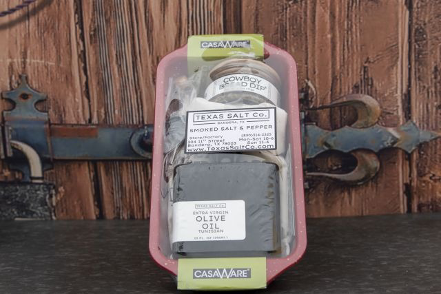Includes a bottle of Tunisian Olive Oil, Cowboy Bread Dip, Smoked Salt & Pepper, and Casaware Bread Pan