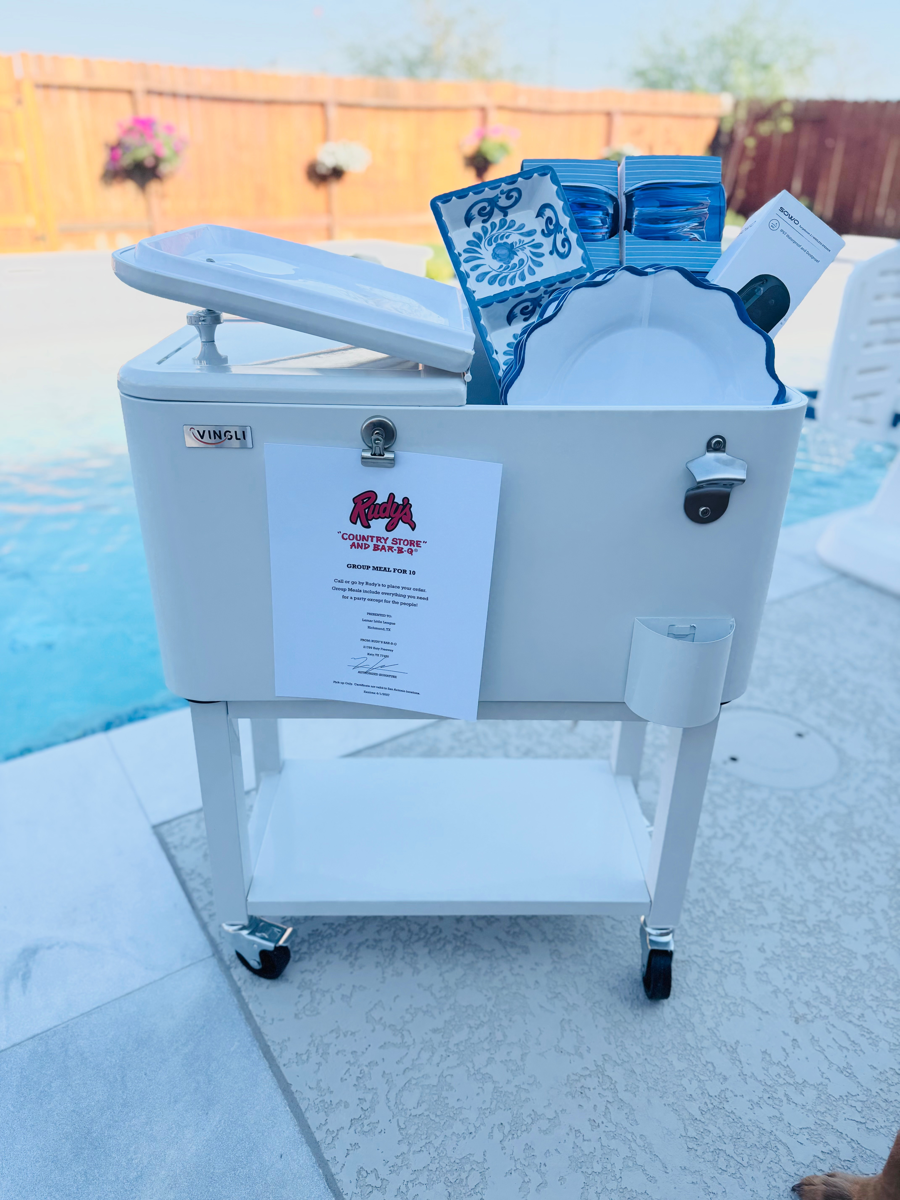 Kickin’ Off Summer Texas Nights - Get ready for the perfect backyard evening. This package includes a vintage-style rolling cooler filled with beautiful blue-and-white summer serve ware, a waterproof Bluetooth speaker to keep the music going, and a Rudy’s “Country Store” and Bar-B-Q group meal for 10, perfect for feeding friends and family.