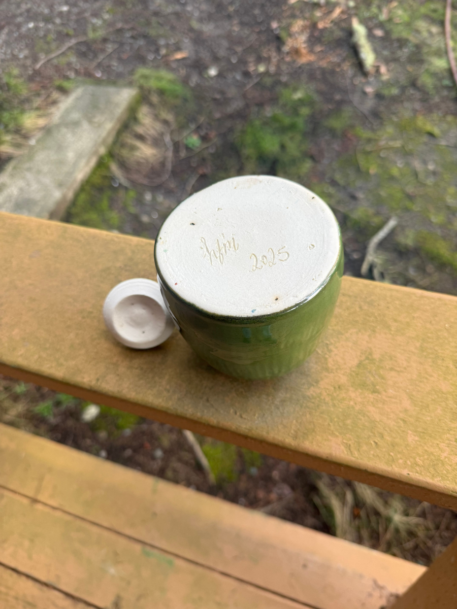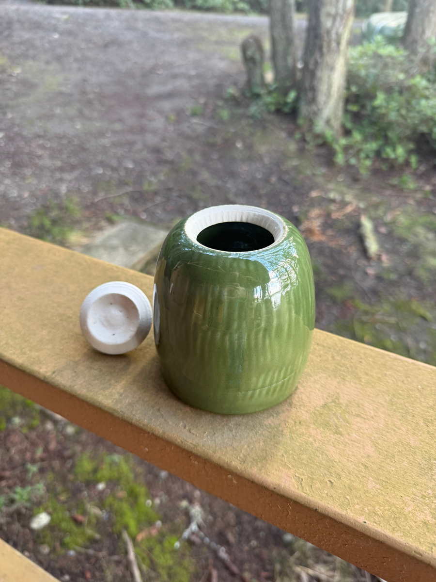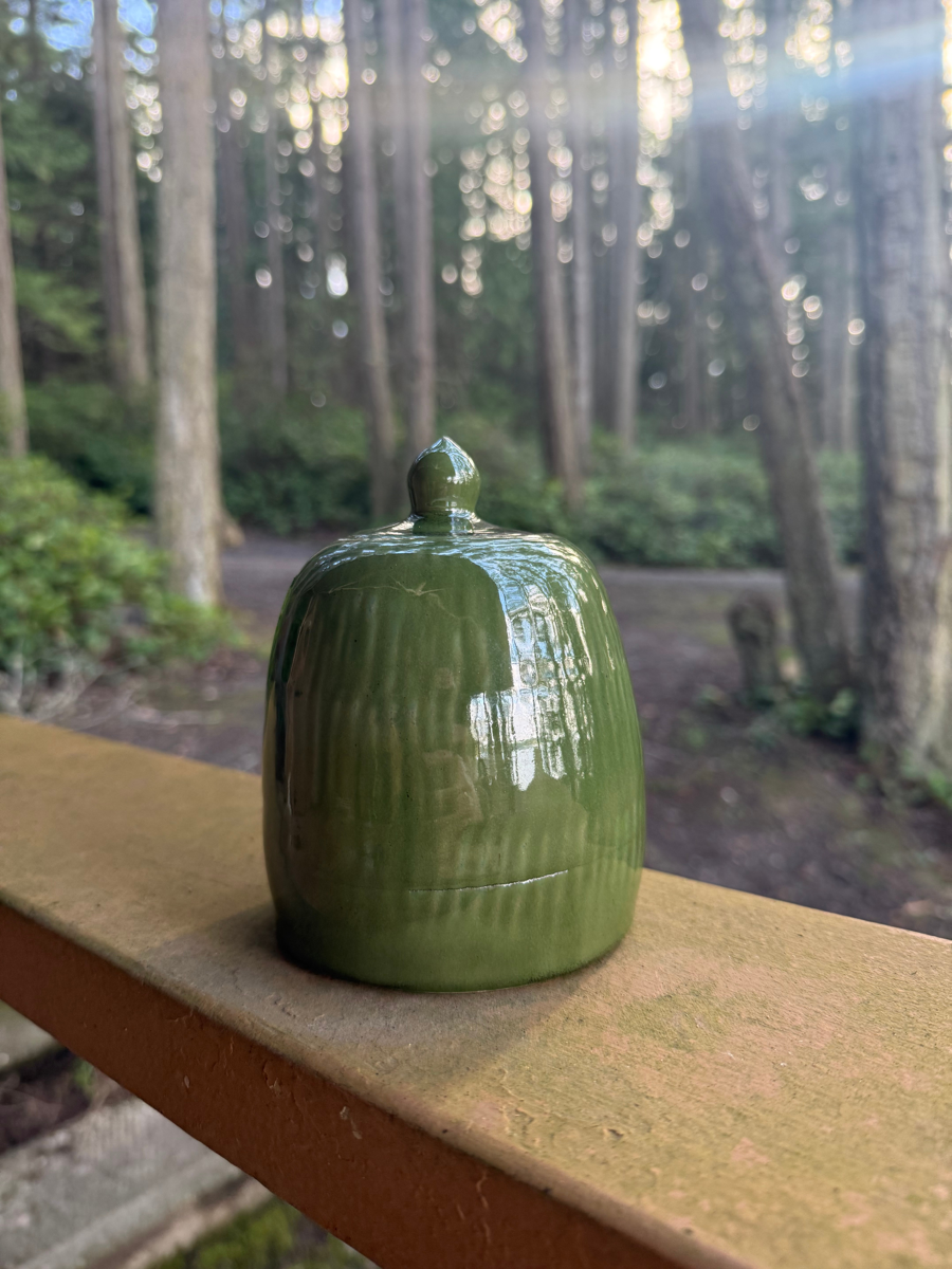 This glossy, textured vessel recalls the fields of seaweed rippling underwater just off shore of Canoe Island. It was made by counselor Helen Murphy. Hide your island treasures inside this gorgeous vessel! It measures 5.5" tall by 4".