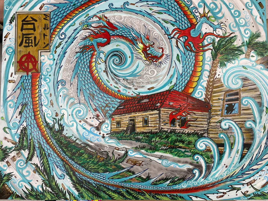 This powerful 2.0' x 2.5' piece, titled That Dragon Milton, was created in response to the devastation caused when Hurricane Milton destroyed the artist’s neighborhood.