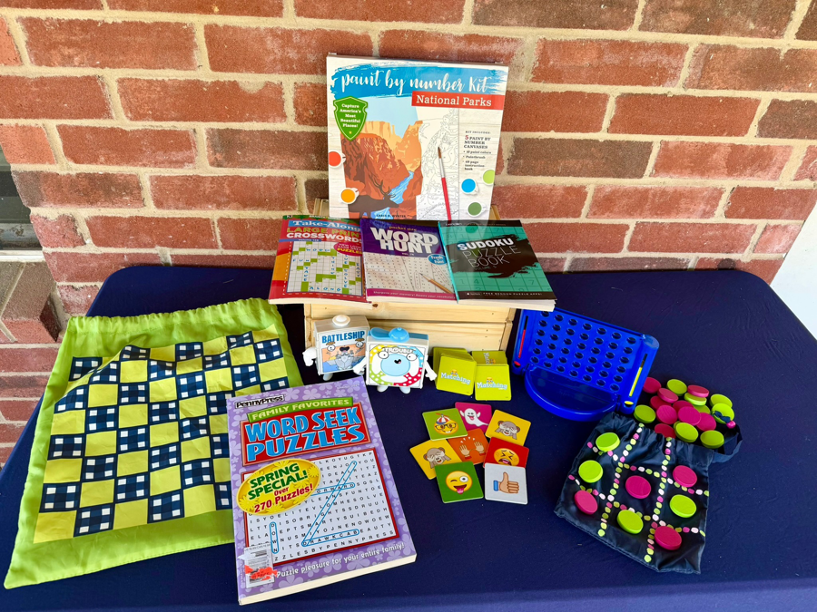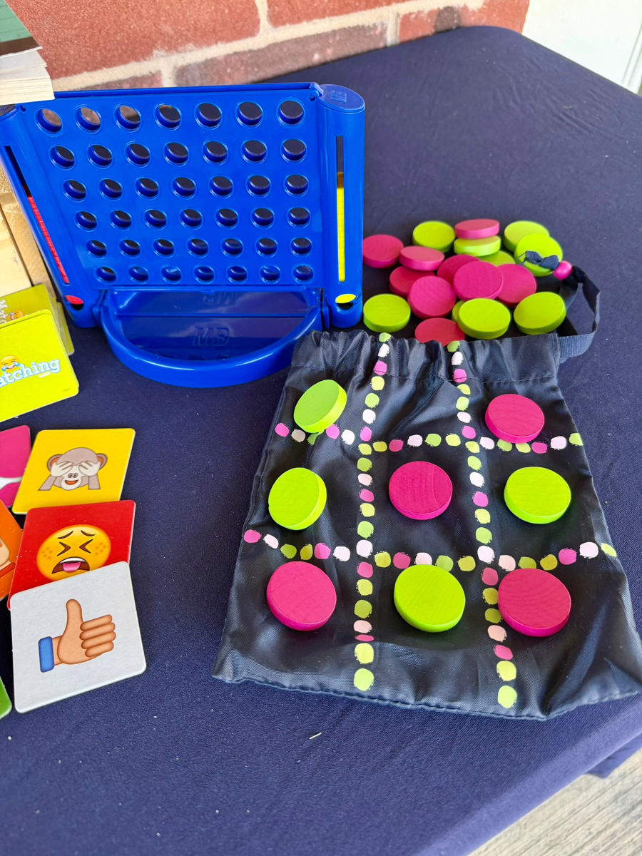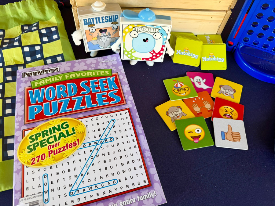 The Games: Travel versions of the classics: Battleship, Trouble, Connect Four, Tic-Tac-Toe, and a fun Emoji Matching Game.