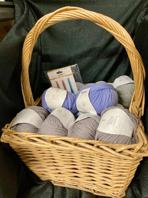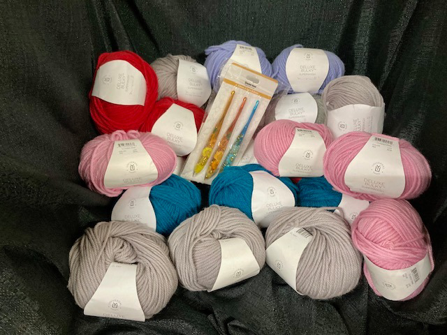 A crocheter's dream basket is in the offering of this item with 21 balls of Universal Yarn - deluxe bulky 100% superwash wool yarn in a variety of colors and a beautiful floral set of crochet hooks (5.0, 5.5, and 6.0mm)