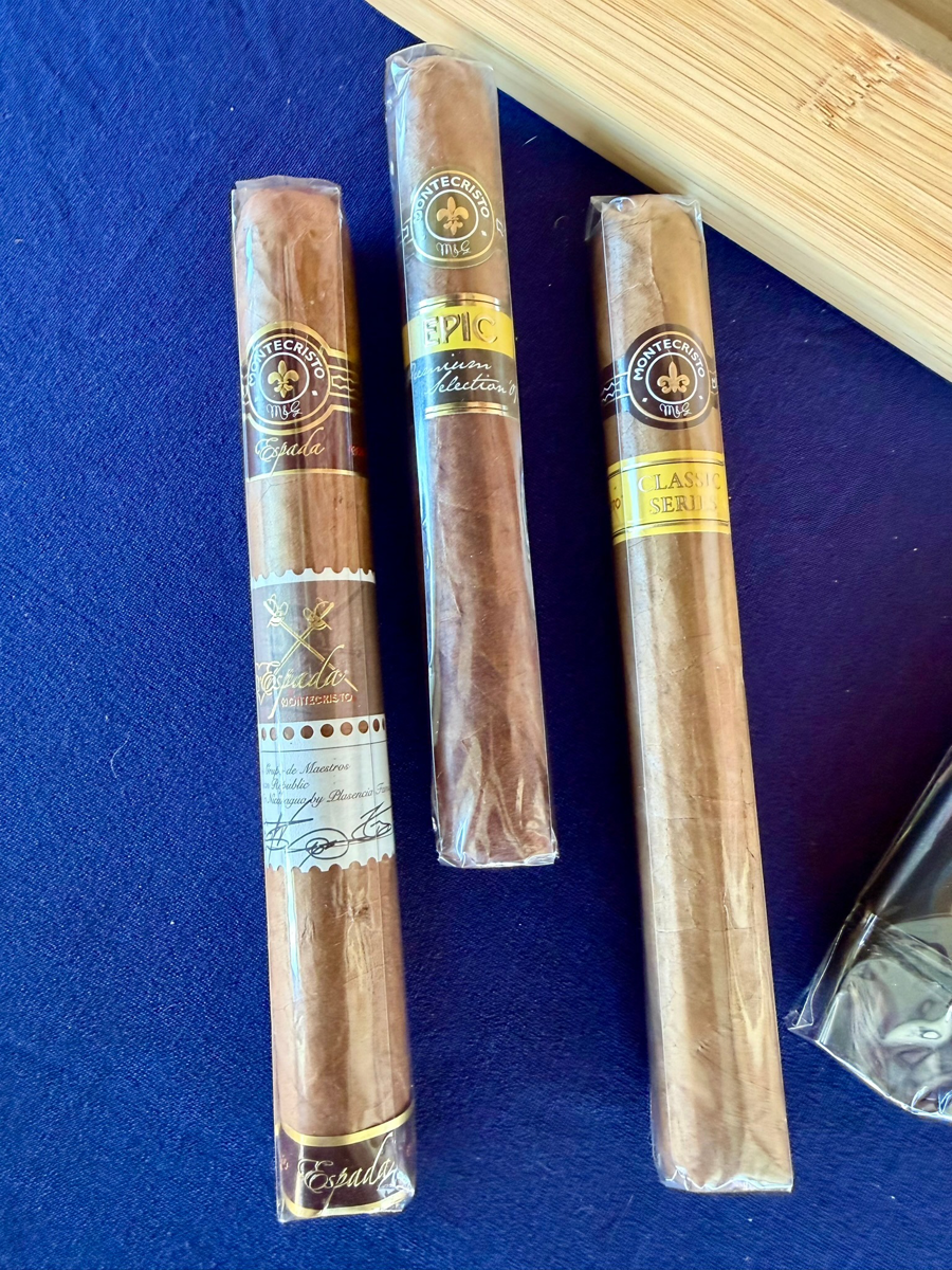 The Smoke: A curated trio of premium cigars (including a Montecristo and an Epic selection) for a variety of flavor profiles.