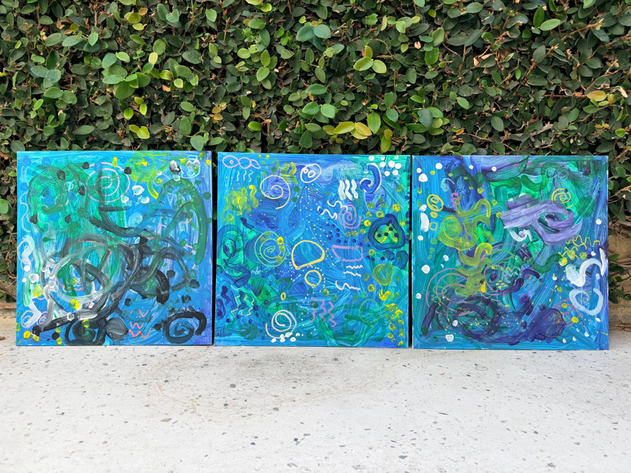 This dynamic, three-panel work, titled "The Deep Blue Garden," is a powerful testament to the uninhibited creativity of young artists. Crafted collaboratively by Mrs. King's class, this triptych is a rich, energetic abstract piece dominated by vibrant blues, greens, and aquamarines, suggesting the mystery of a teeming underwater world or a magical night garden. Specifications: • Medium: paint on canvas • Artists: Mrs. King's Kindergarten Class • Dimensions of individual painting: 16"x16" This piece will be delivered to the buyer framed. Thank you to Newcomb's Art Teacher, Mrs. Romero, for her collaboration with the Newcomb Academy Foundation to produce this work of art.