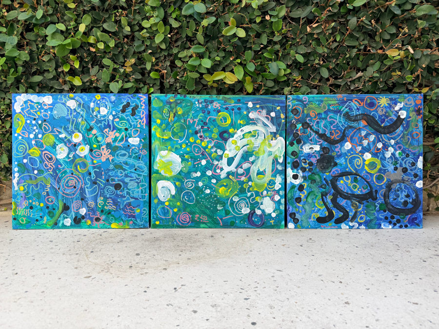 This dynamic, three-panel work, titled "The Deep Blue Garden," is a powerful testament to the uninhibited creativity of young artists. Crafted collaboratively by Mrs. Spaseff's class, this triptych is a rich, energetic abstract piece dominated by vibrant blues, greens, and aquamarines, suggesting the mystery of a teeming underwater world or a magical night garden. Specifications: • Medium: paint on canvas • Artists: Mrs. Spaseff's Kindergarten Class • Dimensions of individual painting: 16"x16" This piece will be delivered to the buyer framed. Thank you to Newcomb's Art Teacher, Mrs. Romero, for her collaboration with the Newcomb Academy Foundation to produce this work of art.