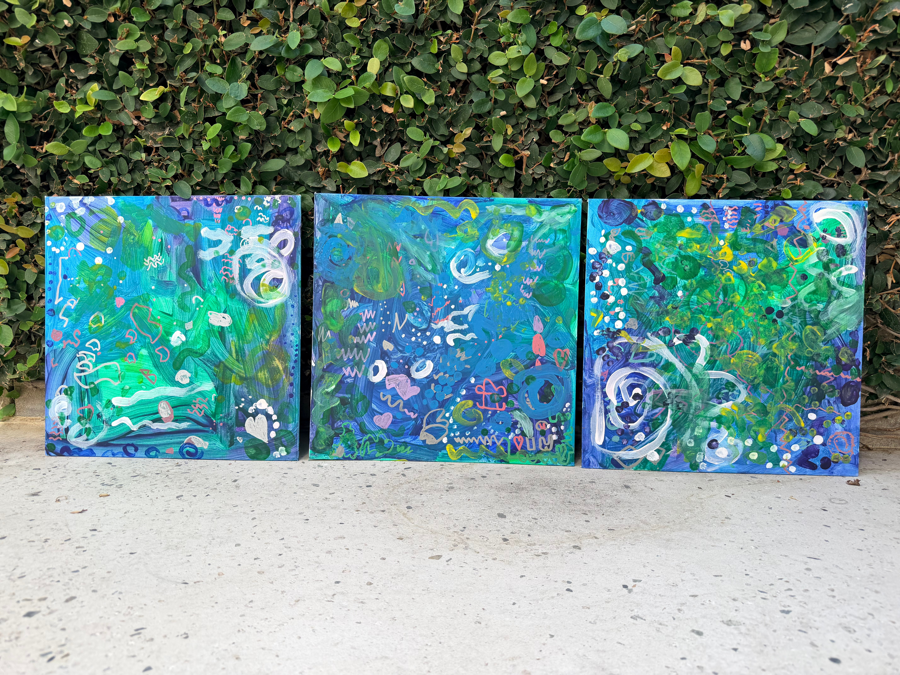 This dynamic, three-panel work, titled "The Deep Blue Garden," is a powerful testament to the uninhibited creativity of young artists. Crafted collaboratively by Ms. Strouse's class, this triptych is a rich, energetic abstract piece dominated by vibrant blues, greens, and aquamarines, suggesting the mystery of a teeming underwater world or a magical night garden. Specifications: • Medium: paint on canvas • Artists: Ms. Strouse's Kindergarten Class • Dimensions of individual painting: 16"x16" This piece will be delivered to the buyer framed. Thank you to Newcomb's Art Teacher, Mrs. Romero, for her collaboration with the Newcomb Academy Foundation to produce this work of art.