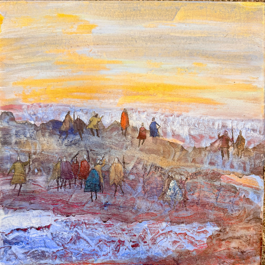 A procession moves across a textured landscape, suspended between arrival and departure. Layered washes and spare marks emphasize collective presence over individual identity. The open horizon invites viewers to imagine the purpose of this convergence and to stand, momentarily, among those who have come together.