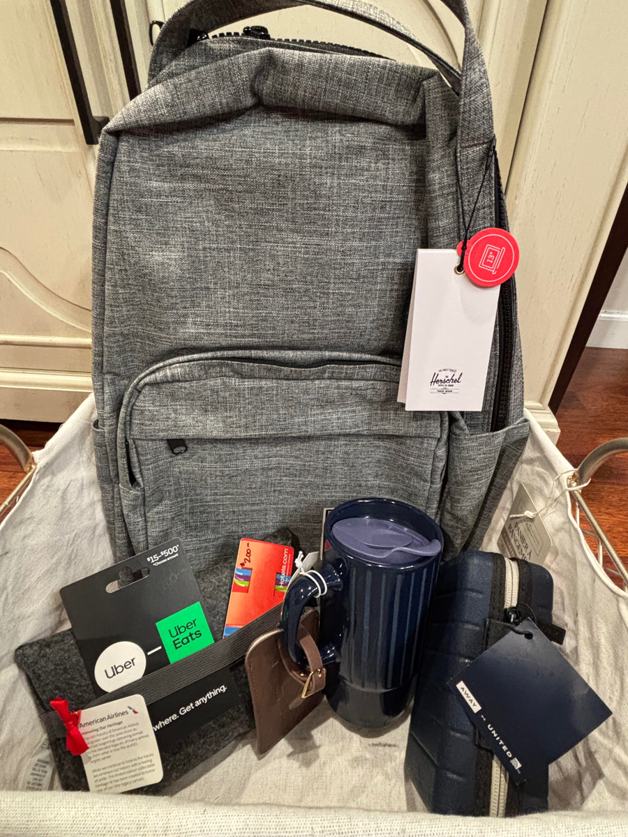 Herschel Travel backpack, $200 Hotels.com Gift Card, $100 Uber eats Gift Card, United Airlines first class amenity kit.