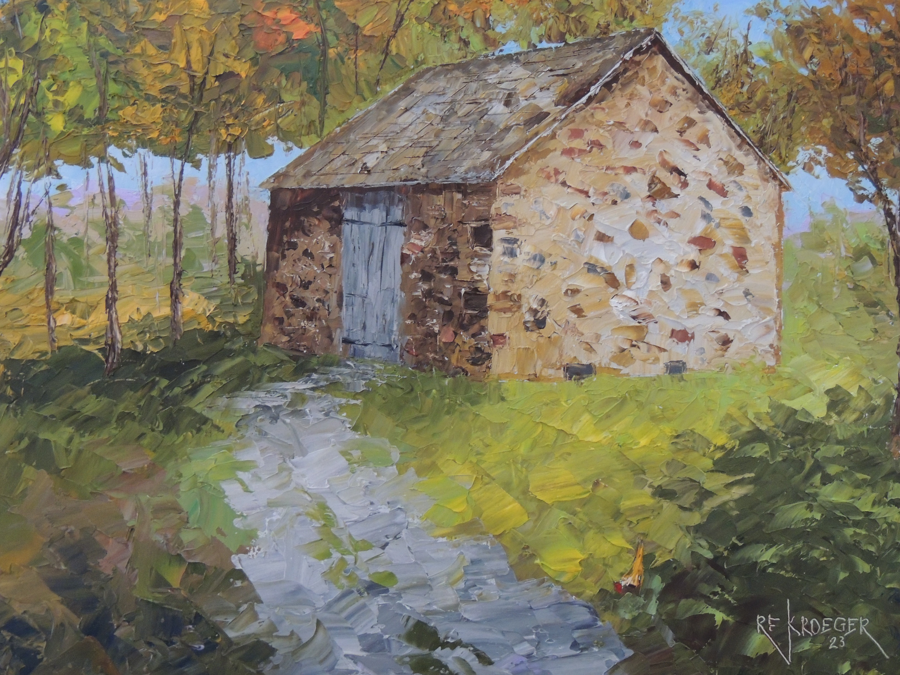 New Castle County, DE. 9x12". This colorful fieldstone barn, a small garden variety of the English three-bay style, dates to 1809 and lies within the Eastburn-Jeanes Lime Kilns Historic District, which was listed on the National Register in 1977. The story involves the family's entry into the early lime industry of the 19th-century and its many lime kilns. This painting can be seen at the Morgan County Historical Society, located in McConnelsville, Oh. Call with questions 740 962-4785