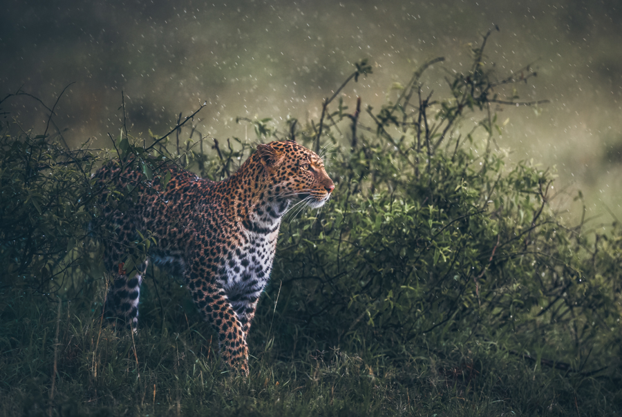 A word from the photographer: "We found this female leopard late one afternoon in the Maasai Mara and followed her for a while, until she eventually led us to her two tiny cubs, which remains one of my most memorable sightings in the wild. As we spent time with them the rain began to fall, and she quietly slipped away to hunt, using the sound of the rain to mask her movements. The light softened, the atmosphere changed, and everything came together in this single moment that still feels incredibly special to me. Size: A2 Unframed and all shipping, tax and tariffs will be the responsibility of the buyer.