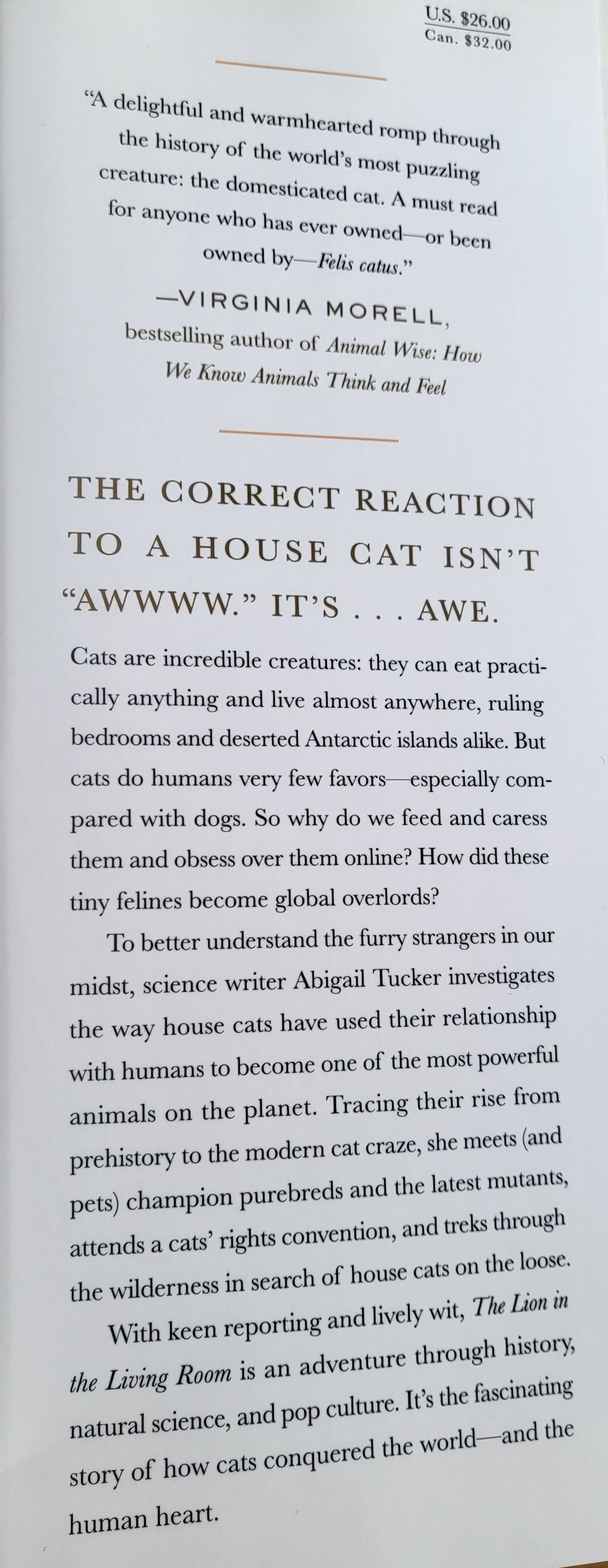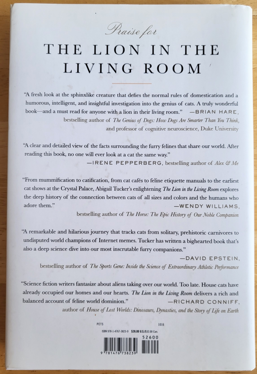 You'll learn a lot about the history and studied behavior of house cats in this book, and it's not all pretty, but very insightful. Learn about purebred cats, humans who advocate for TNR on a national level, how cats compare with dogs, and much more in this 241 page book by Abigail Tucker, with lots of references. Very gently used.