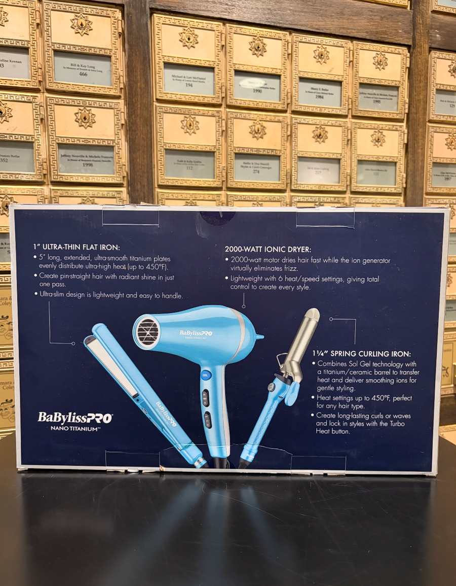 Unlock the ultimate salon‑worthy hair styling experience with the BaBylissPRO Nano Titanium Trifecta Gift Box BNTPP49TUC. This premium limited edition set bundles three essential professional tools designed with advanced Nano Titanium technology to deliver smoother, shinier, and frizz‑free results every time. With a powerful 2000‑watt hair dryer, ultra‑thin 1″ flat iron, and versatile 1¼″ spring curling iron, you’ll enjoy fast drying, precise straightening, and effortless curls all from one beautifully packaged gift box. Ideal for every hair type and styling need, this set brings pro performance into any home or travelling kit.
