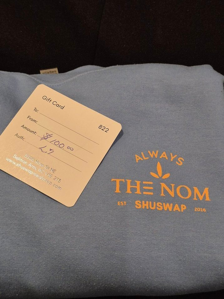 Treat yourself to fresh, healthy meals from The Nom Shuswap with this $100 gift card, perfect for enjoying their nutritious dine in/take out offerings and convenient meal prep options. Paired with it is a unisex heavy-blend sweatshirt (size XL), designed for everyday comfort and easy wear. The sweatshirt features a subtle logo on the front and a larger statement logo on the back, with long sleeves and a super-soft interior—ideal for cooler days. A cozy and feel-good package that fuels both comfort and wellness.