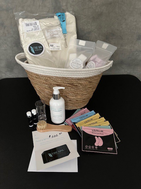 Gift Basket includes a $500 Gift Card to The Spa At Rock Barn; One (1) Spa Robe; One (1) Package of Lavender Shower Steamers; One (1) Package of Peppermint Shower Steamers; One (1) Green Tea and Lemongrass Body Lotion; One (1) Wooden Facial Scrub Brush; Nine (9) Eye Masks; Two (2) Lip Masks; Two (2) Lip Balms; One (1) and basket of product samples. Expires: