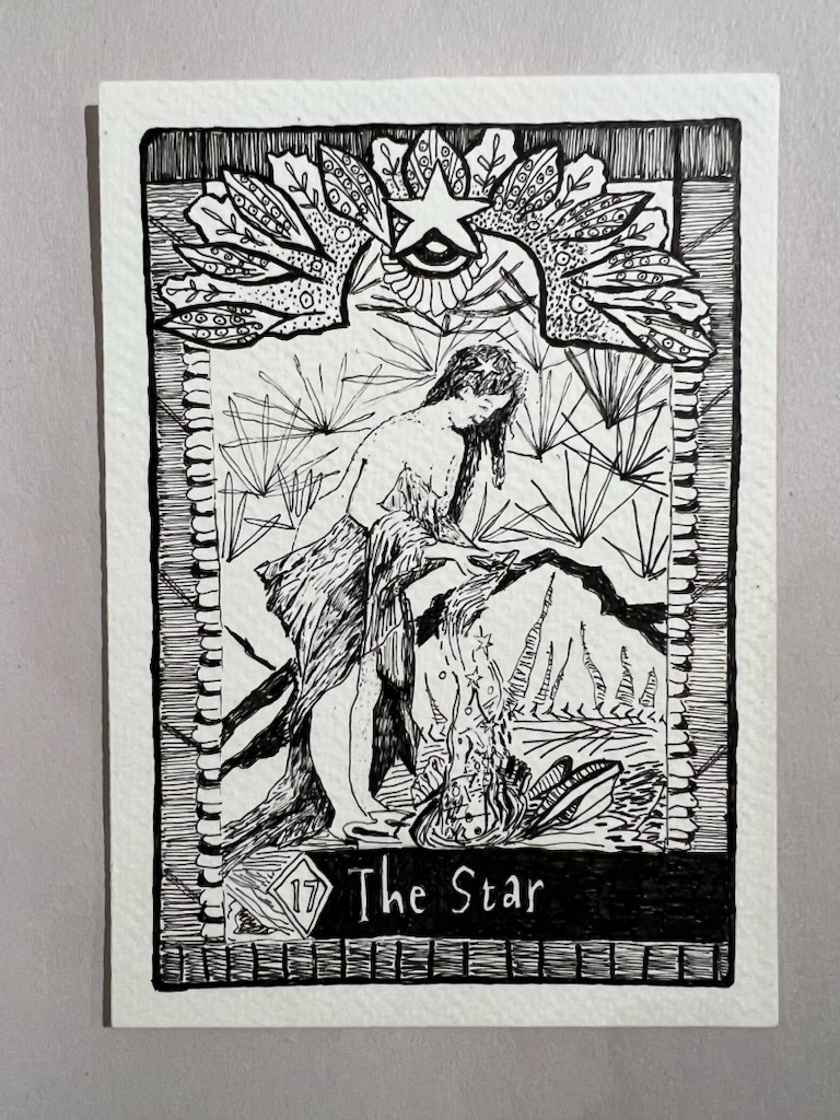 Representation of THE STAR from the major arcana, image inspired by the Zerner Farber deck. 4 x 6" archival ink on heavy weight acid free paper. Perfect for an altar.