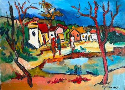With colorful houses surrounded by greenery as the background, three figures are having a conversation at a pond. Using wide, expressive brush strokes, the artist depicts a vibrant village life. Desarmes was a true friend of the project; we will always be grateful for his contributions and his beautiful interpretations of Haitian landscapes and homes. He will be missed!