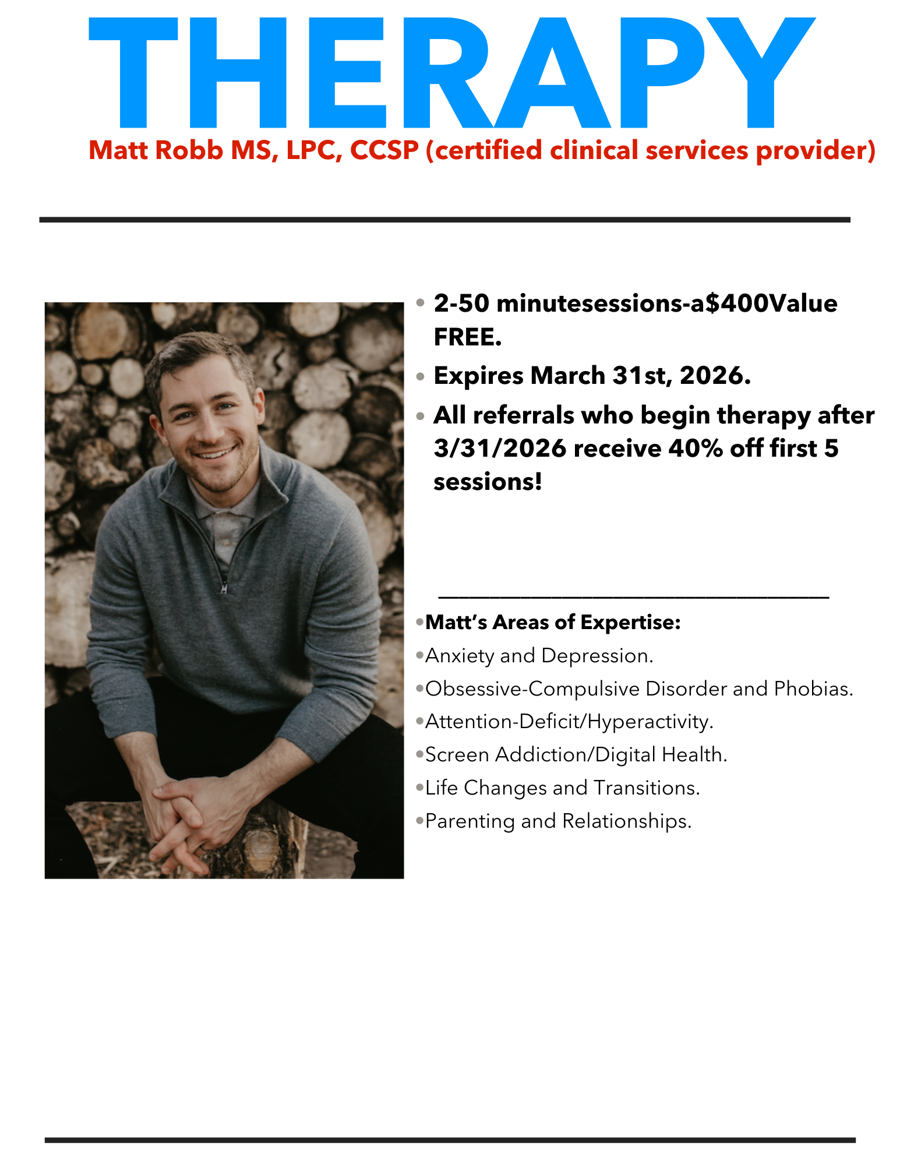 Experience transformative therapy with Matt Robb, a certified clinical services provider, through two 50-minute sessions designed to address a variety of mental health challenges. Whether you are struggling with anxiety and depression, navigating the complexities of OCD or ADHD, or dealing with screen addiction and digital health issues, Matt is here to help. He specializes in guiding individuals through life changes and transitions, as well as providing support for parenting and relationship concerns. This valuable opportunity, worth $400, is available for a limited time and must be redeemed by March 31st, 2026. Don't miss your chance to invest in your mental well-being and personal growth!