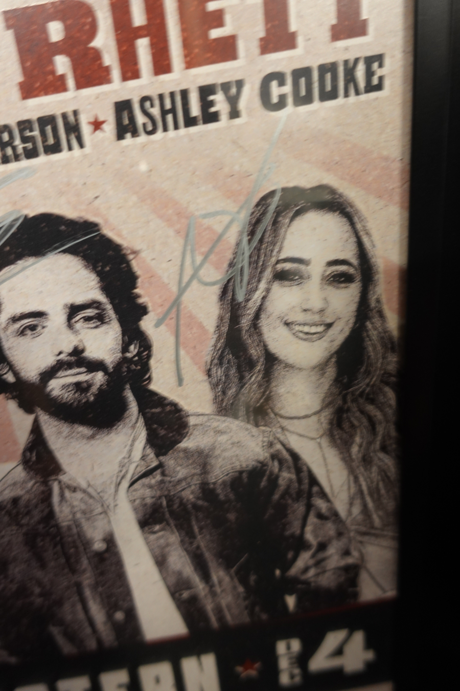 This listing is for a Thomas Rhett, American country music singer-songwriter, & friends signed event poster with autographs by Thomas Rhett, Riley Green, Russell Dickerson, and Ashley Cooke. Frame is 13" x 19"