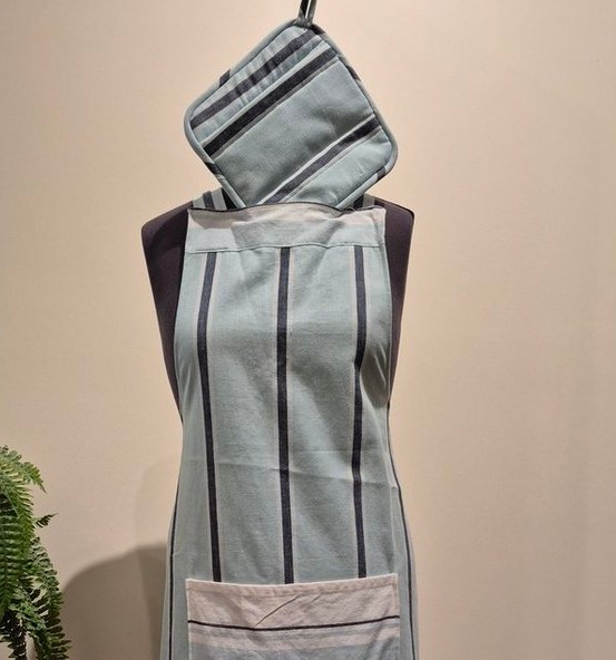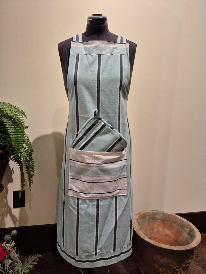 Perfect for the baking and cooking artists in your life, this beautiful handmade apron combines style and function. Designed with a large front pocket and comfortable crisscross back ties, it offers full coverage and ease of movement in the kitchen. The set also includes a matching padded pot holder for a coordinated touch. Featuring soft blue tones with hints of navy and white, the colors are perfectly inspired by our lake community, bringing a fresh, relaxed charm to every culinary creation.