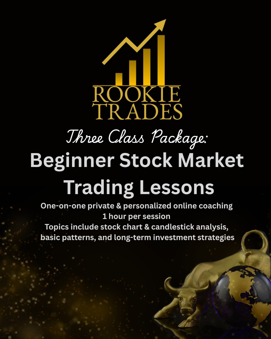 Want to learn stock market trading skills? Take three private & personalized, one-on-one, classes of Beginner Stock Market Trading Lessons (one-hour duration via Google Meet) with Steve Hoffner of Rookie Trades.com. This three class package normally costs $500! Topics include stock chart & candlestick analysis, basic patterns, and long-term investment strategies. We'll even throw in a trading journal, cap, and pen to start you on your way!