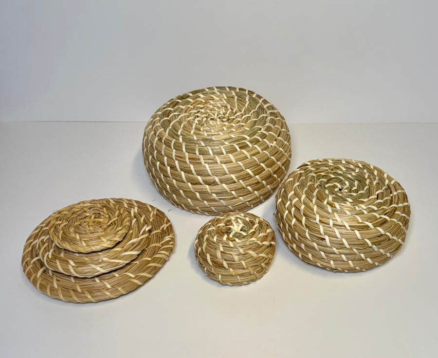 Round woven baskets hand made of natural sweetgrass with lids that can be used for storage of small items or simply as a timeless addition to the decor.