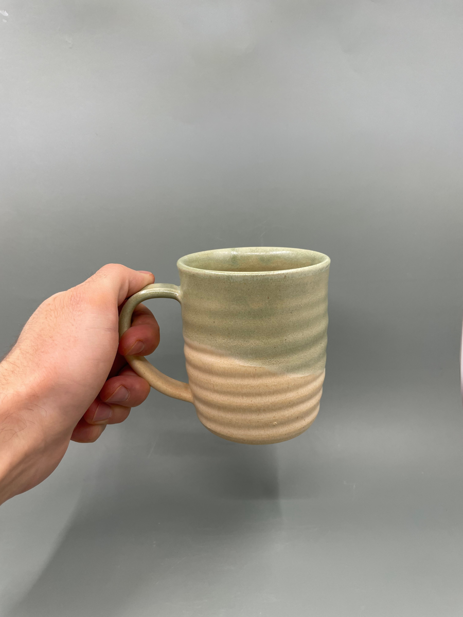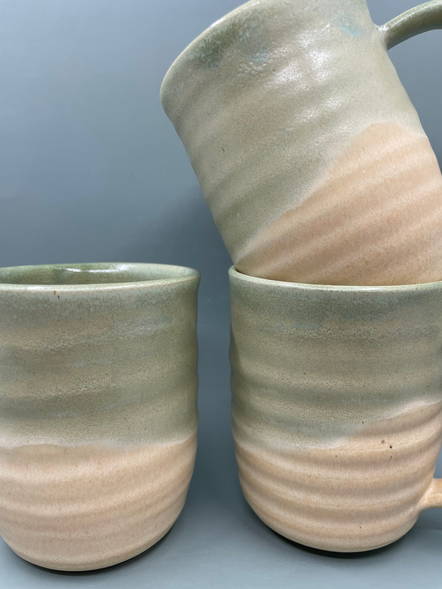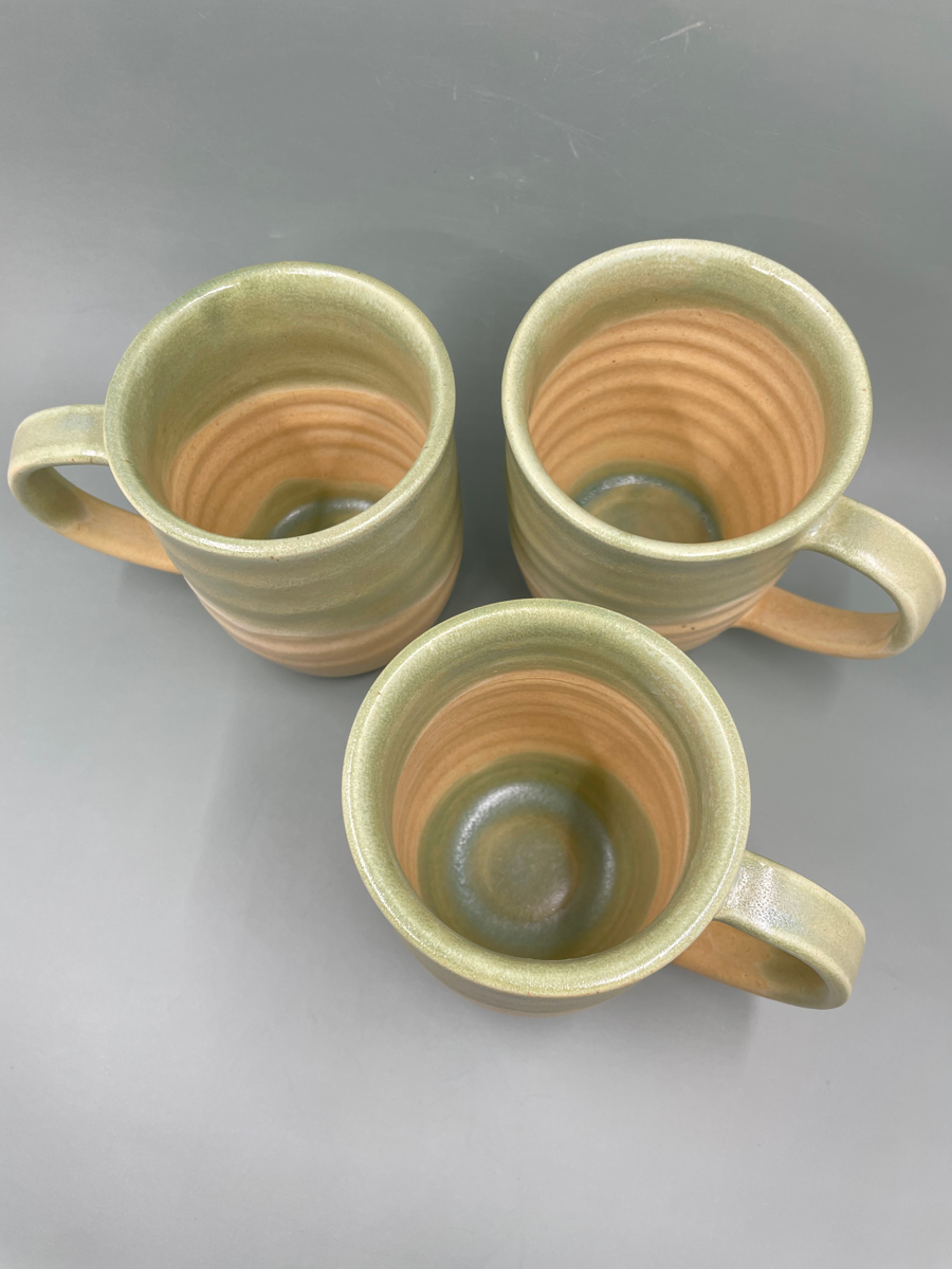 This set of three stunning mugs were hand-thrown by longtime CIFC staff member Joey Henderson. He glazed the mugs to resemble foamy waves crashing on a seashore and each mug holds a hidden tide pool of pearlescent green. They each hold about 12 oz.